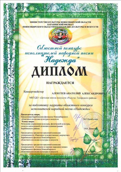 Диплом Областного фестиваля-конкурса исполнителей народной песни "Надежда", 2012 г.