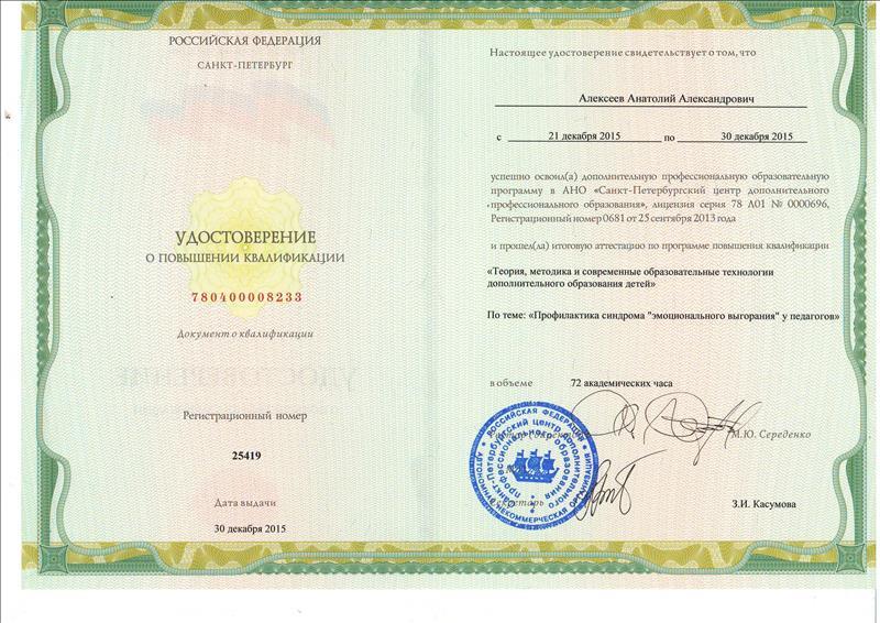 Удостоверение о повышение квалификации по теме "Профилактика синдрома "эмоционального выгорания" у педагогов", 2015 г.