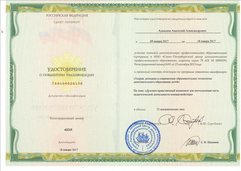 Удостоверение о повышении квалификации по теме:"Духовно-нравственный компонент как неотъемлемая часть педагогической деятельности концертмейстера", 2017 г.