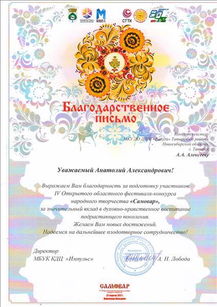 Благодарственное письмо IV Открытого областного фестиваля-конкурса народного творчества "Самовар"