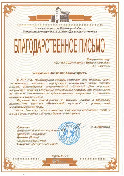 Благодарственное письмо Новосибирского государственного областного Дома народного творчества